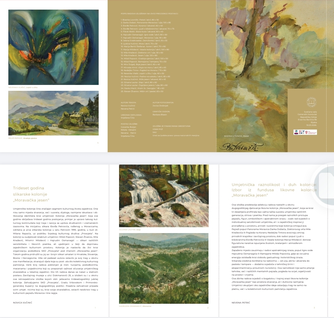 Изложбу је отворила генерална конзулка Републике Србије у Ријеци Ивана Стојиљковић, која је уједно поздравила присутне, заједно са Зораном Станковићем, председником ВСНМ ПГЖ, и професором Новицом Вучинићем, председником СКД „Просвјета“ Моравице и директором Ликовне колоније.
